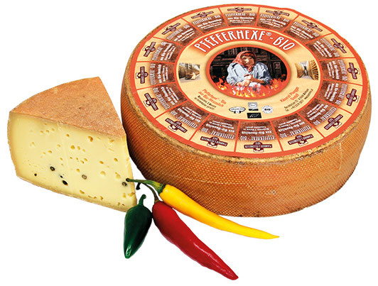 Plangger´s Bio Pfefferhexe ist ein pikanter Schnittkäse aus Heumilch mit ganzen Pfefferkörner im Teig.